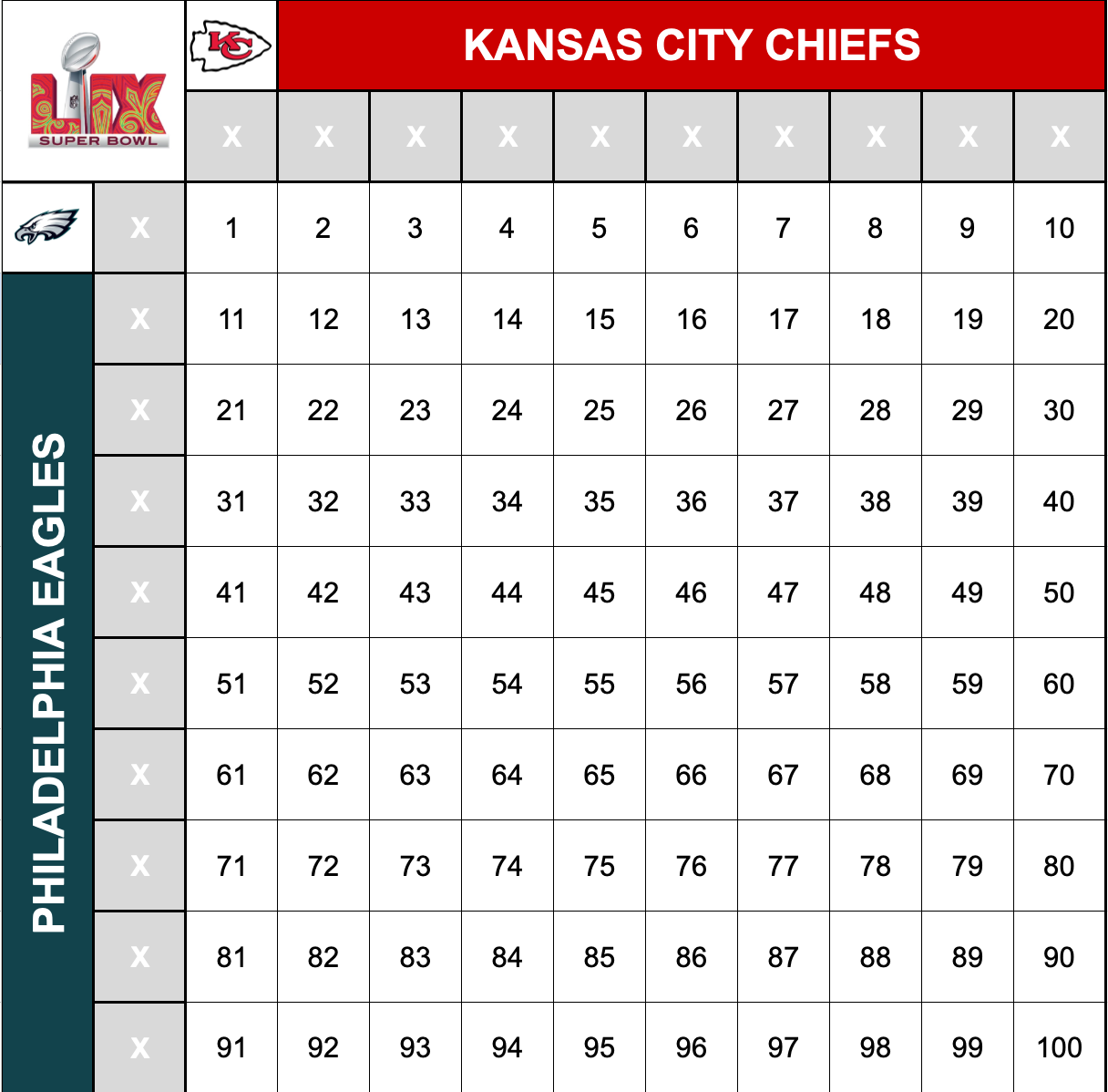 How it works: At the end of each quarter, the winner will be determined if you have the the square that matches up with the last digit in each team’s score. Winners will be determined at the end of the first quarter, second quarter, third quarter, plus the final game score. The winner of each quarter is decided by looking at the last number in each teams' score and then matching those digits on the grid to see where the squares intersect on Board 1 and Board 2.